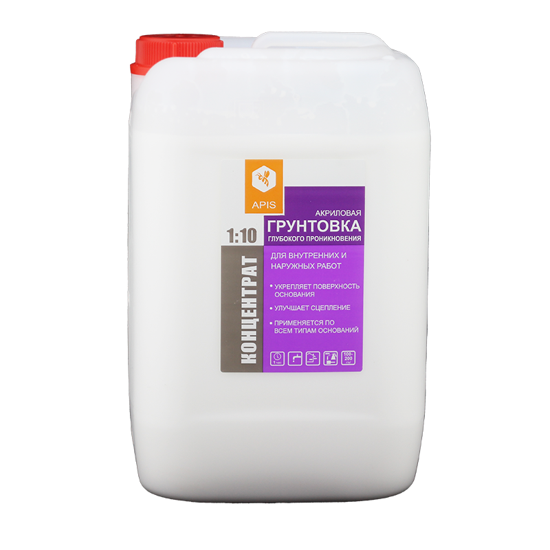 Концентрат 1:10 грунтовки глубокого проникновения предназначен для приготовления в домашних условиях рабочего раствора грунтовки для обработки стен, полов и пр. с целью подготовки поверхности к финишной обработке: покраске, поклейке обоев.