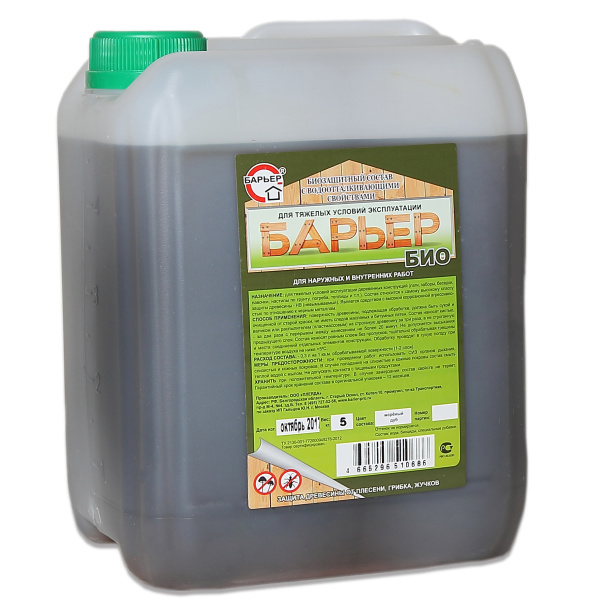 - Биозащитный состав для древесины Барьер-БИО придаёт древесине темно-коричневый оттенок «моренный дуб» и подходит для обработки строительных и деревянных конструкций. При этом не рекомендуется использовать его в качестве декоративного покрытия, так как оттенок может иметь зеленоватые отливы.